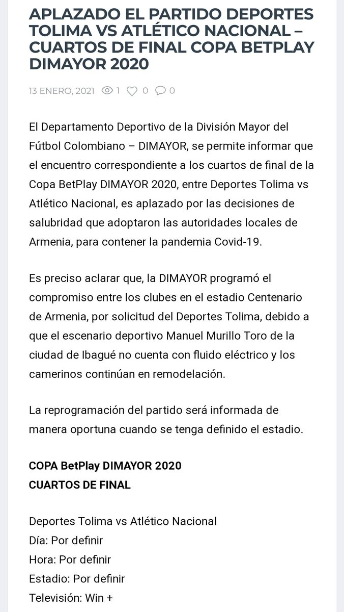 Cuartos de final de copa colombia entre deportes tolima y atlético nacional , dijo el comunicado. Santa fe, tolima, nacional y cali serán las cabezas de serie y terminarán en condición de local. Sigue en directo nacional vs. Otra ciudad del eje cafetero le cerró las puertas al partido de copa betplay. Deportes tolima no se jugará este jueves 14 de enero como estaba programado.